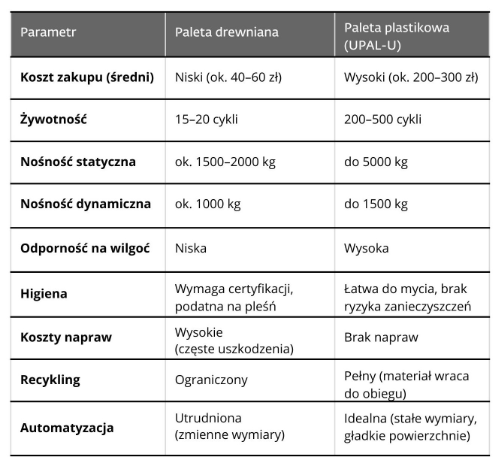 Choć cena zakupu jest wyższa, palety plastikowe mają kilkukrotnie dłuższą żywotność niż drewniane. W obiegu zamkniętym minimalizuje się ryzyko utraty i uszkodzeń, co redukuje koszty napraw i wymiany. Stała tara ułatwia kontrolę w systemach automatycznych, a brak nasiąkania eliminuje problemy z higieną. Po zakończeniu cyklu życia palety Utz są poddawane recyklingowi, co zamyka obieg materiałowy i zmniejsza emisję CO₂. Analizy TCO pokazują, że mimo wyższego kosztu początkowego, całkowite koszty w okresie 5–7 lat są niższe niż w przypadku palet drewnianych, głównie dzięki redukcji strat i kosztów serwisowych.